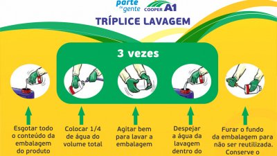 O engenheiro agrônomo da Cooper A1, Celiomar Jose Crestani, da unidade de Itapiranga, afirma que, para receber as embalagens e atender a legislação, alguns passos devem ser seguidos pelos produtores, afim de evitar complicações. “As embalagens devem ser tríplice lavadas, processo de enxaguar três vezes a embalagem vazia”, explica. Critérios que devem ser seguidos:- Após esvaziar a embalagem, deve ser colocada água limpa até ¼ de seu volume (25%);